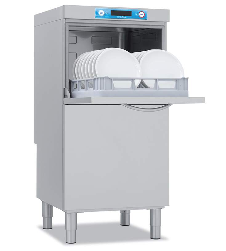 Lavastoviglie frontale ad alta capacità con cesto da 50×60 cm costruita in doppia parete spaziata sui fianchi con guide cesto arrotondate e imbutite e porta in doppia parete integrale.